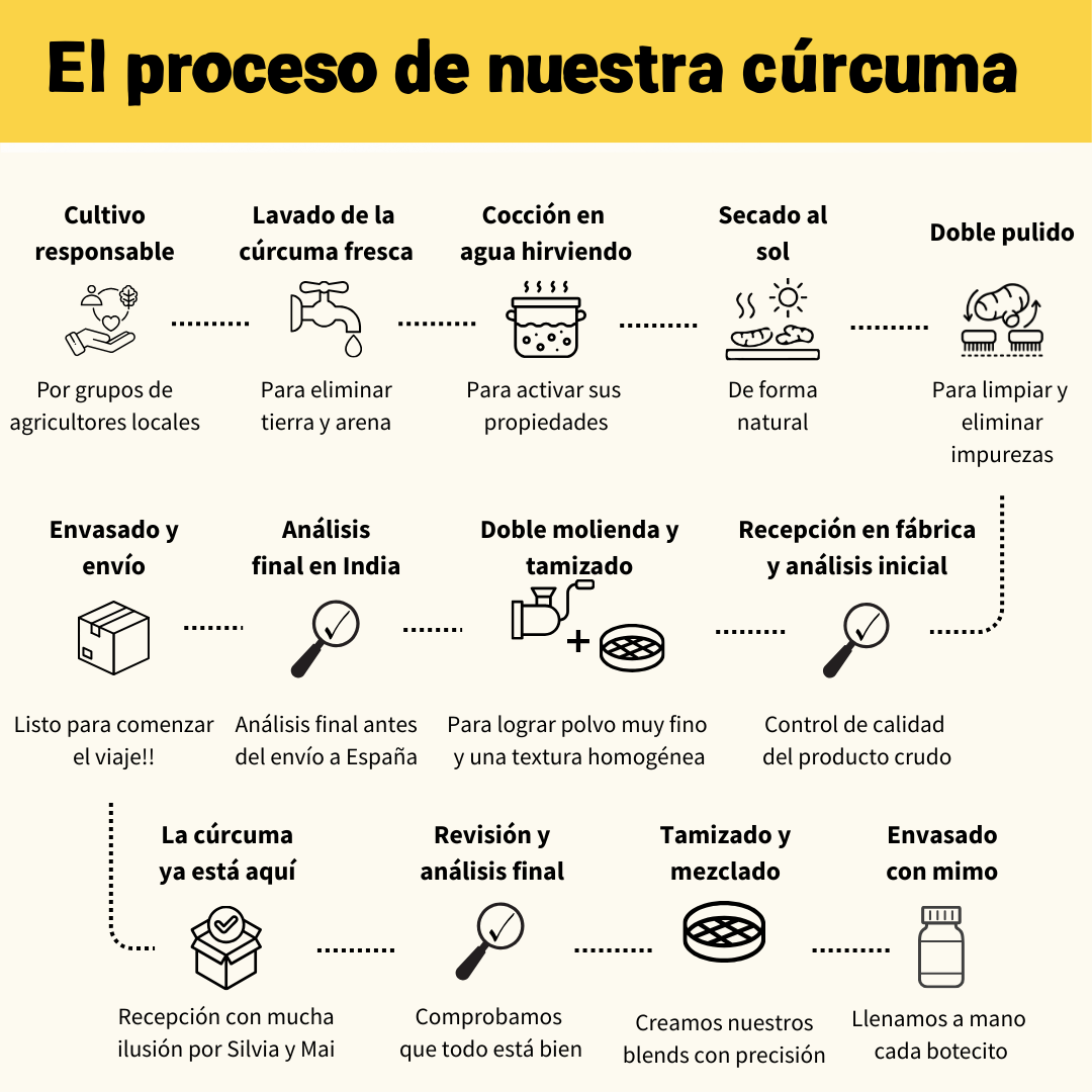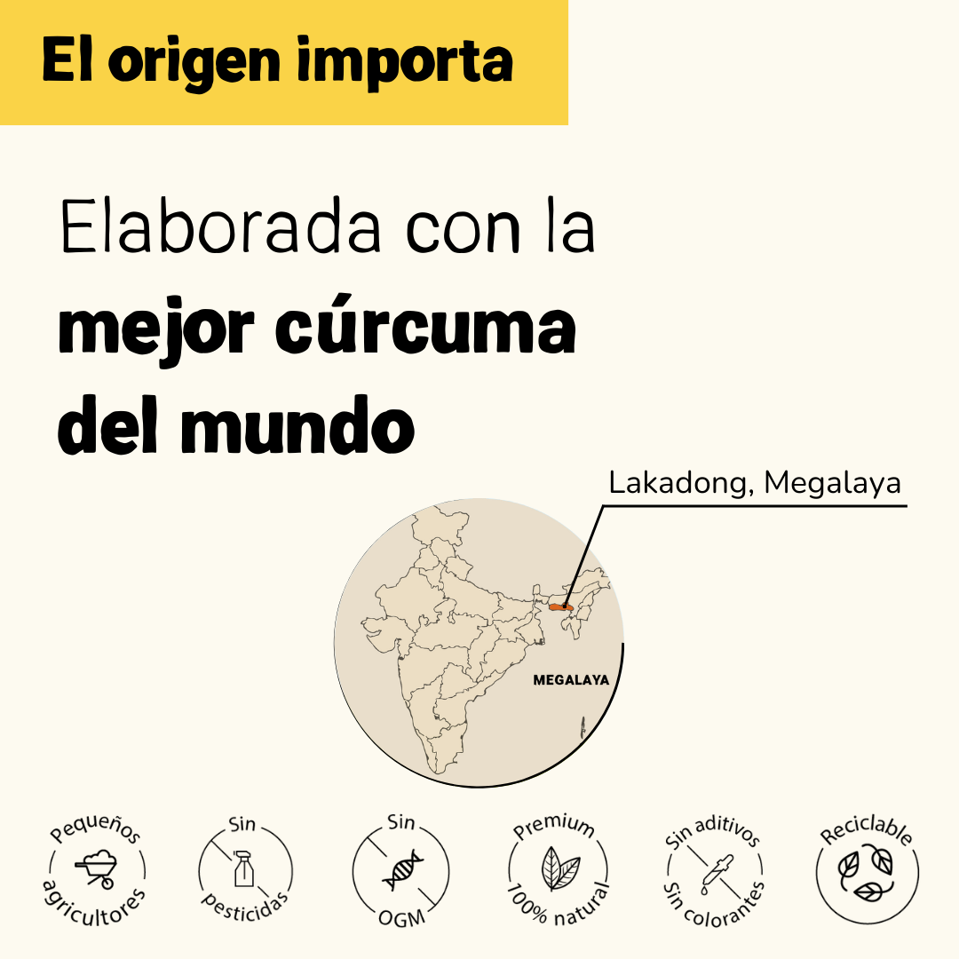 El resultado: una cúrcuma con color intenso, sabor potente y el mayor contenido en curcumina del mundo (7-9%). Perfecta para quienes buscan el máximo poder